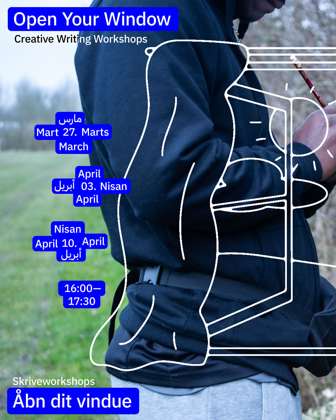 سلسلة ورشات الكتابة “افتح نافذتك” هي جزء من التعاون الإبداعي بين lím collective وVesthimmerland Asylcenter، وتهدف إلى تنظيم وتطوير مبادرات ثقافية بالتعاون مع سكان المركز والممارسين الإبداعيين. lím collective هي منصة عرض فنية يديرها فنانون، ومقرها Aalborg، ولها أنشطة في جميع أنحاء .Jylland شمال